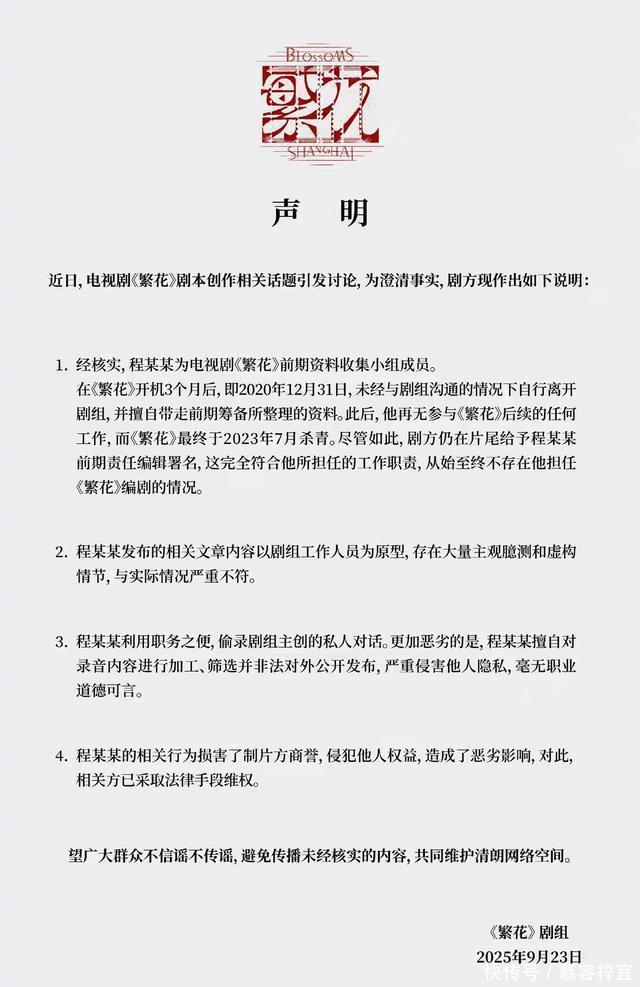 毕竟谁都不想当那个出头鸟,万一得罪了资本或大导演,不仅自己的演艺事业会毁了,甚至可能被整个圈子“封杀”。 繁华里的古二,他在爆料里说,自己花了两年时间写《繁花》的主线剧情。 他跟网友诉苦,不仅要给王导端茶倒水、整理资料,最后功劳全落在秦雯一人身上,秦雯甚至还凭借这个剧本获得了最佳编剧奖,而他连个谢谢都没有。